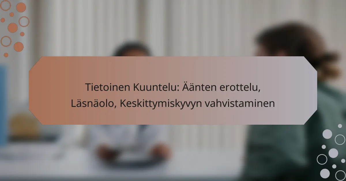 Tietoinen kuuntelu on tärkeä taito, joka koostuu äänten erottelusta, läsnäolosta ja keskittymiskyvyn vahvistamisesta. Näiden komponenttien kehittäminen parantaa vuorovaikutusta ja emotionaalista älykkyyttä, mikä puolestaan voi syventää ihmissuhteita ja tehostaa kommunikaatiota. Erityisesti äänten erottelukyky auttaa ymmärtämään viestintää paremmin meluisissa ympäristöissä, kun taas läsnäolo keskusteluissa mahdollistaa syvemmän yhteyden toisiin ihmisiin.